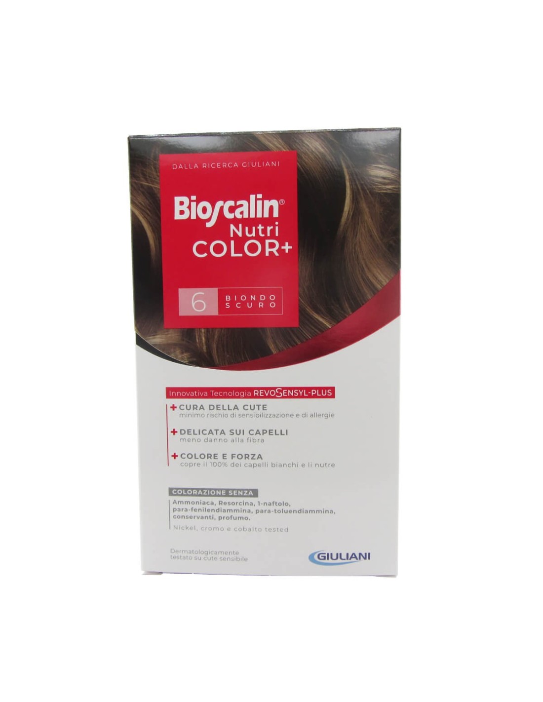 Bioscalin NutriColor Dauerhafte Farbe hat eine cremige Konsistenz, die nicht verläuft. Basierend auf der innovativen RevoSensyl-Plus Technologie enthält es in seiner Formulierung keine der am häufigsten vorkommenden Sensibilisatoren (kein Ammoniak, Resorcin, Para-Phenylendiamin, Para-Toluendiamin, 1-Naphthol (reizende Pigmente), Konservierungsmittel, Parfümstoffe), um eine größere Sicherheit und eine bessere Hautverträglichkeit, eine größere Zartheit und einen größeren Respekt vor der Faser sowie eine bessere Farbleistung bei voller Abdeckung von grauem Haar zu gewährleisten. Respektiert den physiologischen pH-Wert von Kopfhaut und Haar. Die RevoSensyl-Plus Technologie sorgt dafür, dass die Farbe sehr sicher und sanft zu Haut und Haar ist, weniger Juckreiz und Brennen verursacht, das Allergierisiko minimiert, das Haar weniger beschädigt und die Farbe lange hält. Jede Packung enthält 1 Tube Färbecreme 40ml, 1 Applikatorflasche mit Entwicklercreme 60ml, 1 Beutel Colour Protector Shampoo 12ml, 1 Beutel Colour Protector Conditioner 12ml, 1 Paar Einweghandschuhe und 1 Beipackzettel.